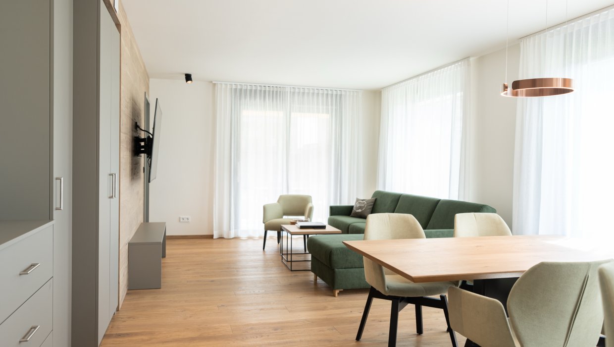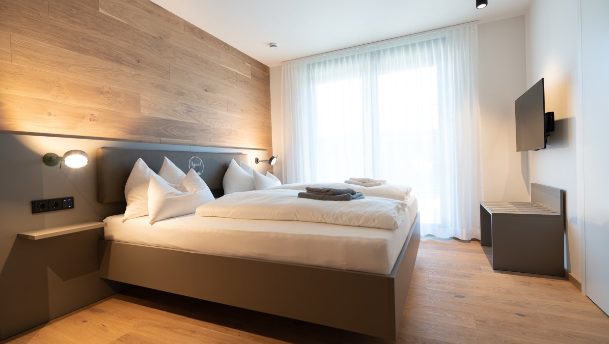Ihr Apartment bietet alpenländische Behaglichkeit und Komfort. Raumhohe Glasfronten und ein Sonnenbalkon von Wohnzimmer, Schlafzimmer und Bad aus geben den Blick frei auf das herrliche Panorama der Allgäuer Hochalpen.