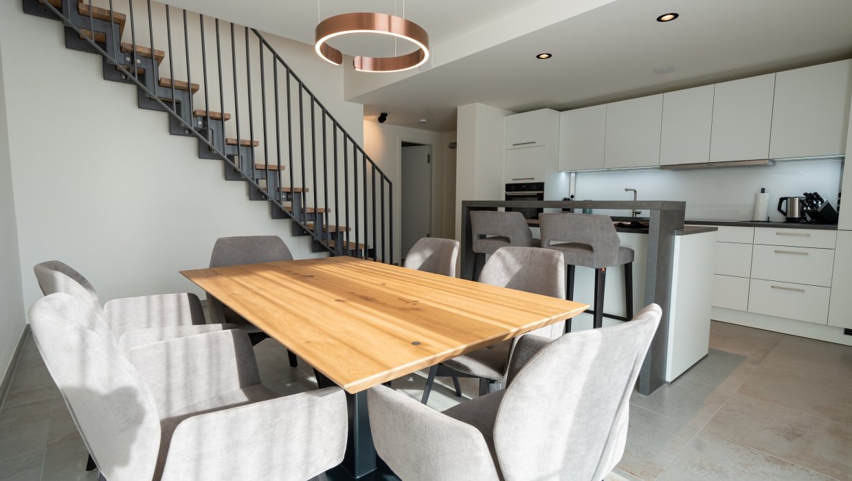 Im 2.OG der Maisonette Wohnung befindet sich die offene Küche mit einer Frühstücksbar und dem Esszimmer, sowie eine zusätzliche Gästetoilette.